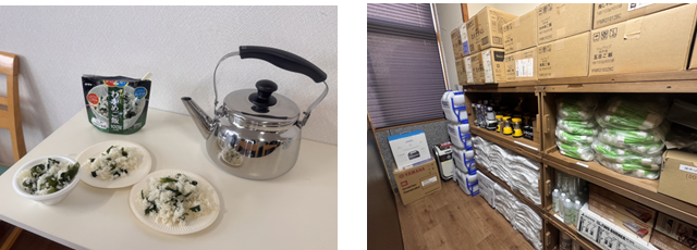 ↑備蓄食(普通食・嚥下食) ↑災害備蓄品倉庫(一目でわかるよう品目別で陳列)